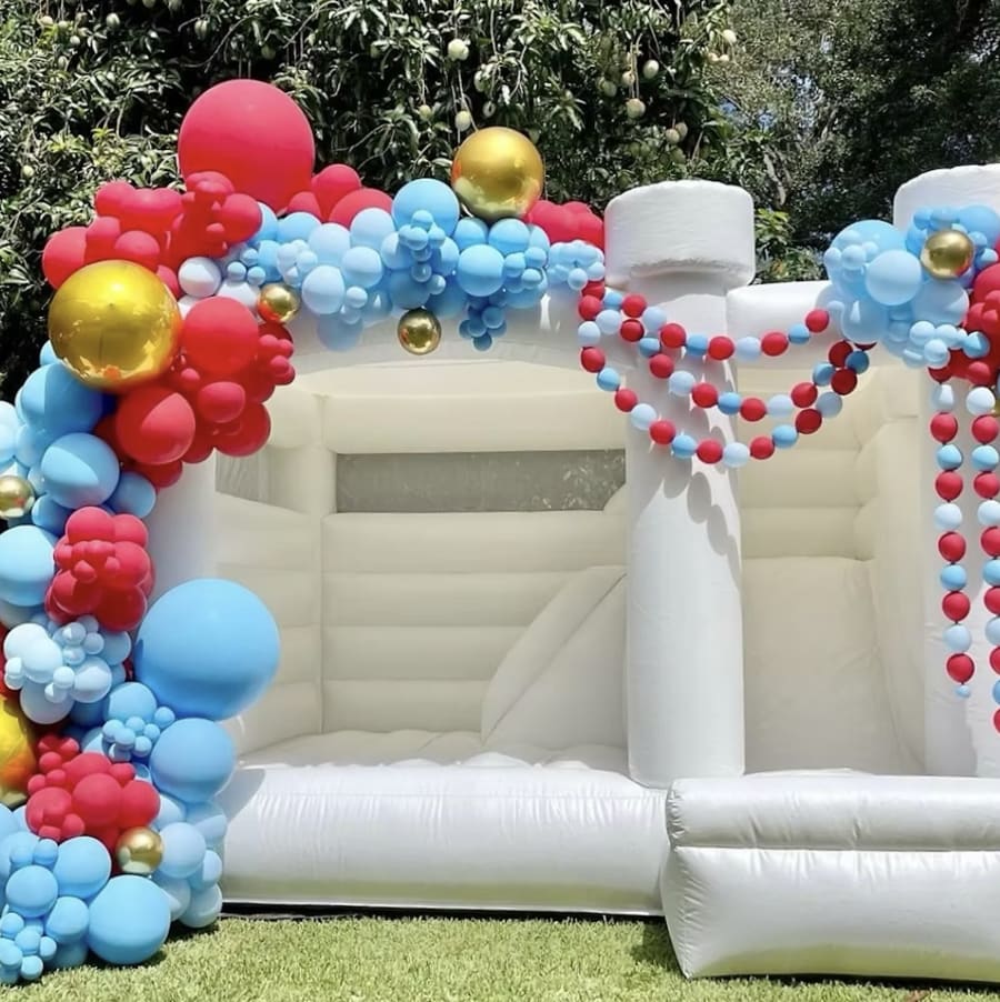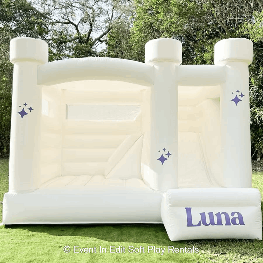 Suitable for large outdoor spaces and flat surfaces. Designed for multiple children at once for higher capacity events. Requires access to a standard power source for blower operation. Setup and breakdown included. Must be supervised at all times during use. With any bounce house rental, soft play customization is included to match your event theme.
