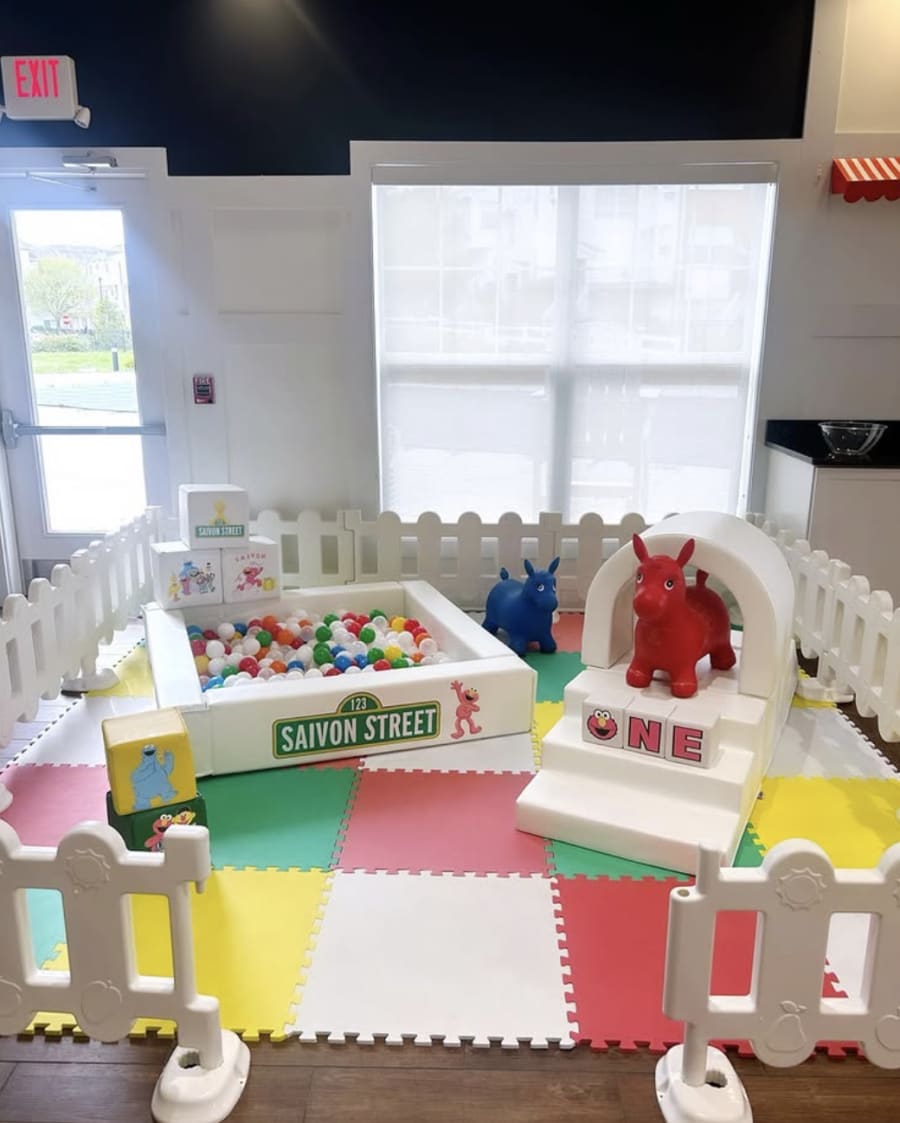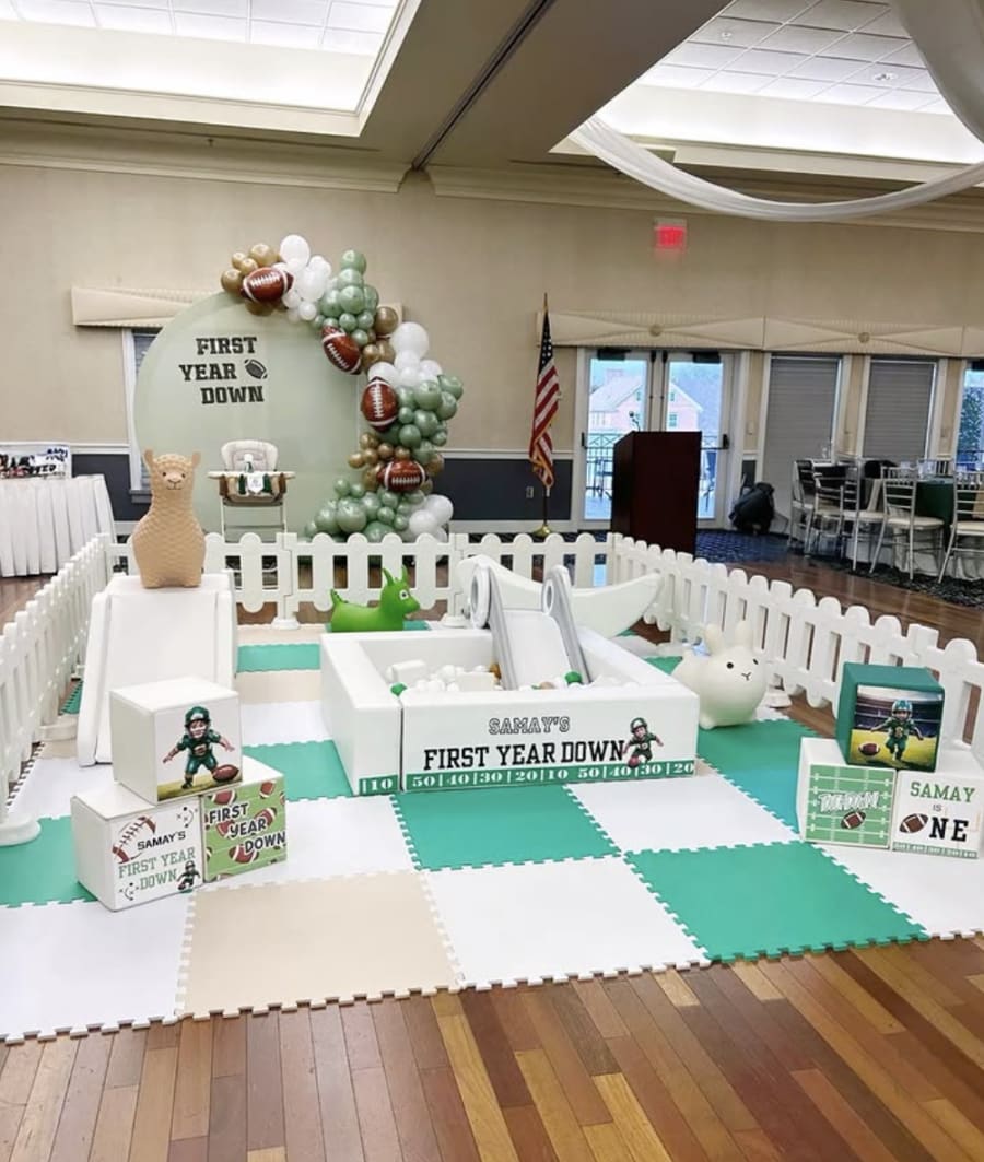 Safety gates, soft foam mats, climbing blocks, ball pit, soft play slide, crawl tunnel, and bouncy animal. All pieces are arranged into a clean, enclosed setup designed for safe toddler play and styled to match your event theme. With any bounce house rental, soft play customization is included to match your event theme. With NO bounce house rental purchase, soft play customization is $50 additional and can be found on the soft play product page.